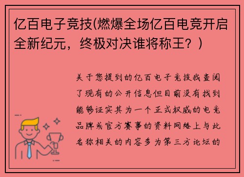 亿百电子竞技(燃爆全场亿百电竞开启全新纪元,终极对决谁将称王?)